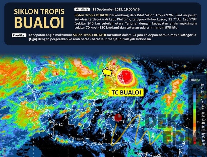 JAKARTA, INDEKSMEDIA.ID – Badan Meteorologi, Klimatologi, dan Geofisika (BMKG) mendeteksi adanya Siklon Tropis Bualoi di Laut Filipina tenggara Pulau Luzon. Fenomena ini diperkirakan memberi dampak tidak langsung bagi Indonesia berupa hujan lebat, angin kencang, dan gelombang laut tinggi di sejumlah wilayah hingga 2 Oktober 2025.