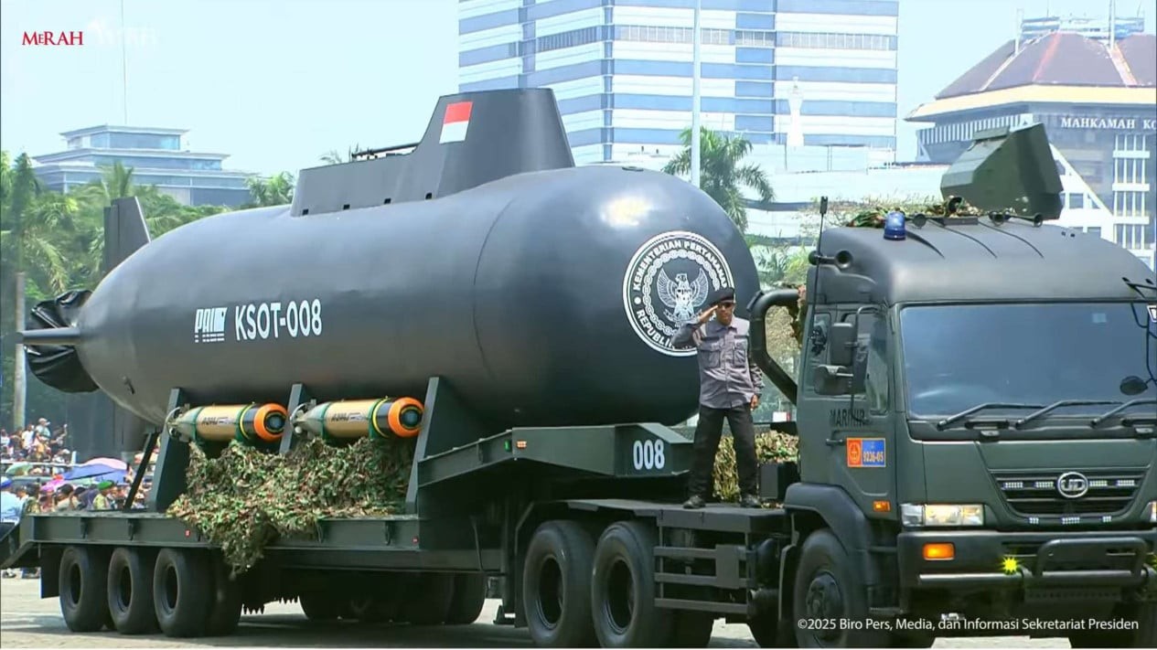 Yang menjadi sorotan utama dalam defile adalah kehadiran kapal selam otonom tanpa awak KSOT-008—produk inovasi anak bangsa yang dikembangkan oleh PT PAL Indonesia.